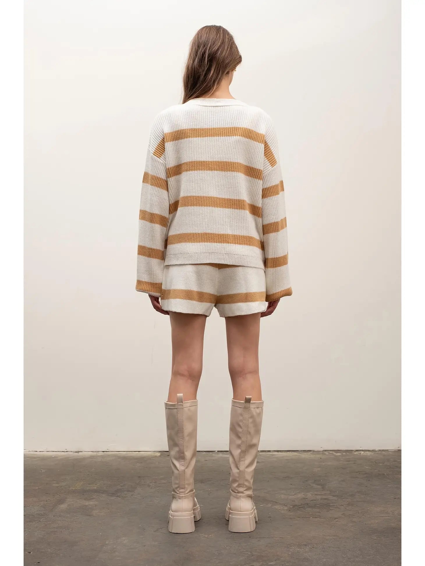 Make every outfit pop with this fun and flirty mustard striped sweater set! Show off your style with the V neckline and balloon sleeves, plus the button-up front and front pockets gives you extra detail. The high rise wide leg shorts with drawstring waist are perfect for a comfy and cute outfit. Get ready to strut your stuff with this adorable set!